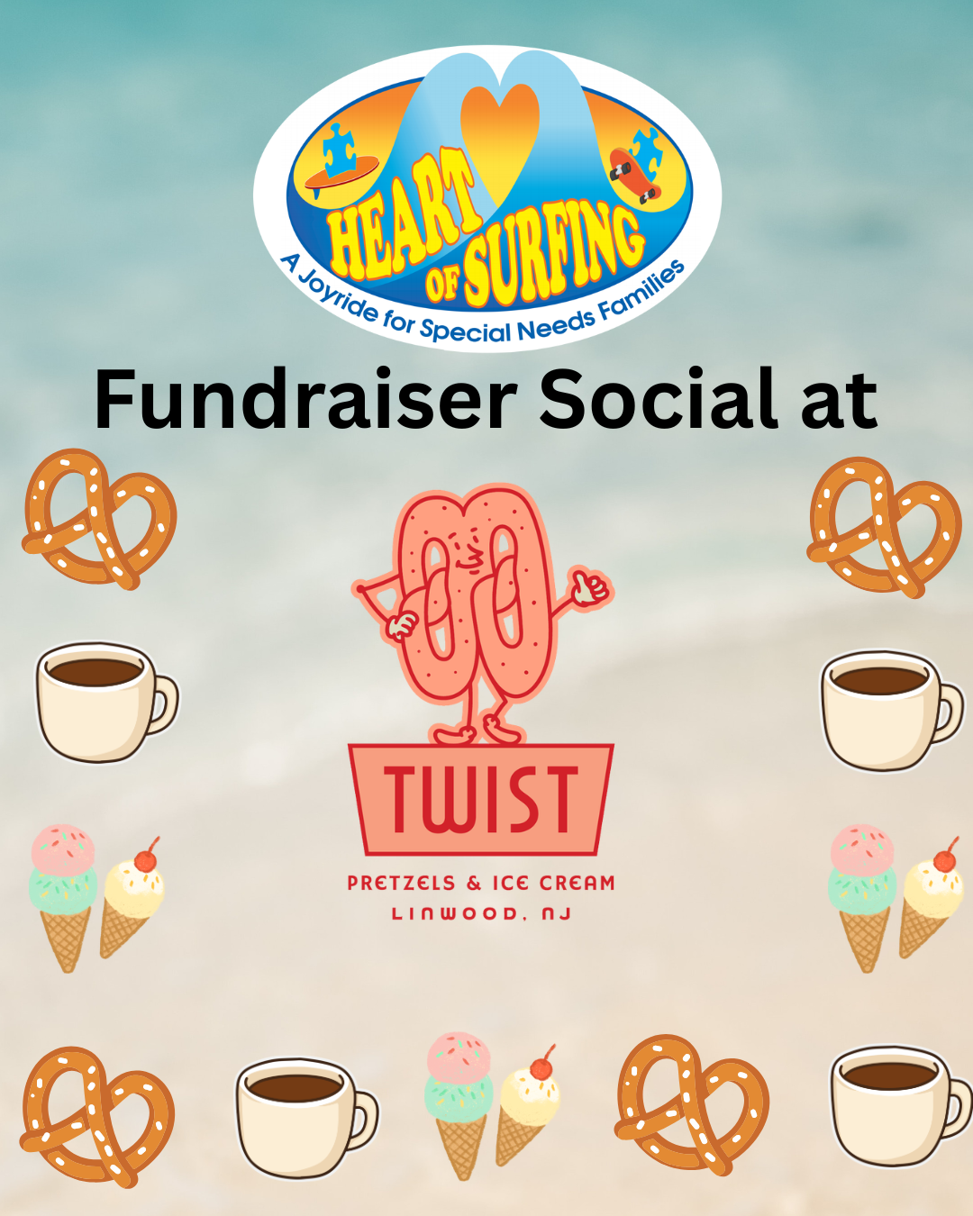TWIST 1413 New Rd, Linwood, NJ, United StatesApril 26, 3pm-6pm Fundraiser Social at TWIST in Linwood Enjoy coffee, ice cream, and raffle prizes while supporting Heart of Surfing. Proceeds benefit our programs. All are welcome! We’re dedicated to providing safe, inclusive spaces for families with autism and related developmental disabilities. Thank you for being part of our community!