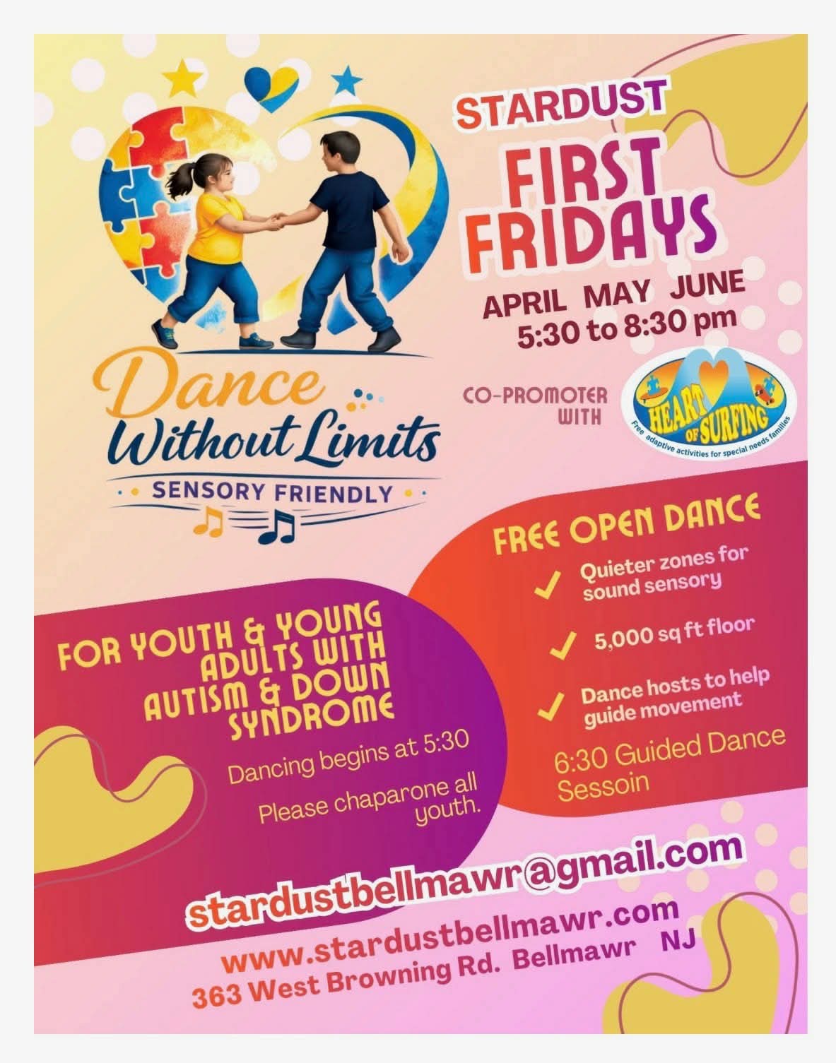 Stardust Dance Studio 363 West Browning Rd, Bellmawr, United StatesStardust Ballroom in Bellmawr 5:30pm-8:30pm Join Heart of Surfing and Stardust for a special needs dance party celebration! No preregistration. All are welcome!