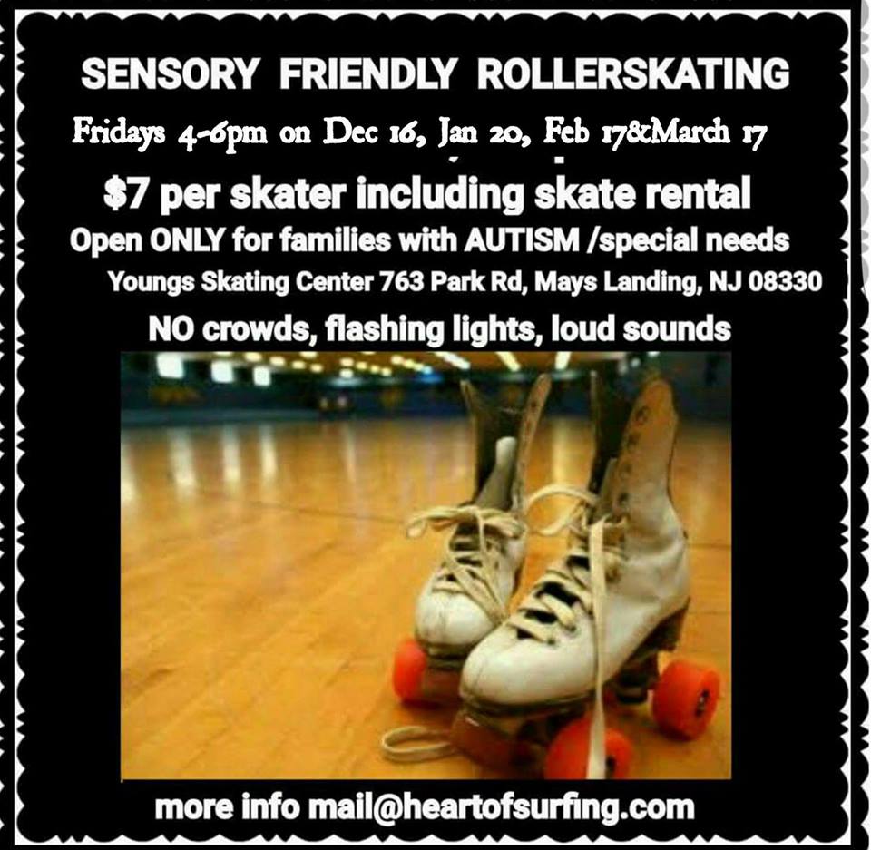 « All Events This event has passed. St Patrick’s Day Rollerskating Party March 17, 2017 @ 4:00 pm - 6:00 pm « CANCELED Hope Farm – Day of Riding – Mom’s Paint Night » Sensory Safe Rollerskating for the Family Join us for a fun time rolling around in circles March 17, 4 pm – 6 pm Add to calendar Google Calendar iCalendar Outlook 365 Outlook Live Details Date: March 17, 2017 Time: 4:00 pm - 6:00 pm Venue Youngs Skating Center 763 Park Road Mays Landing , NJ 08330 + Google Map